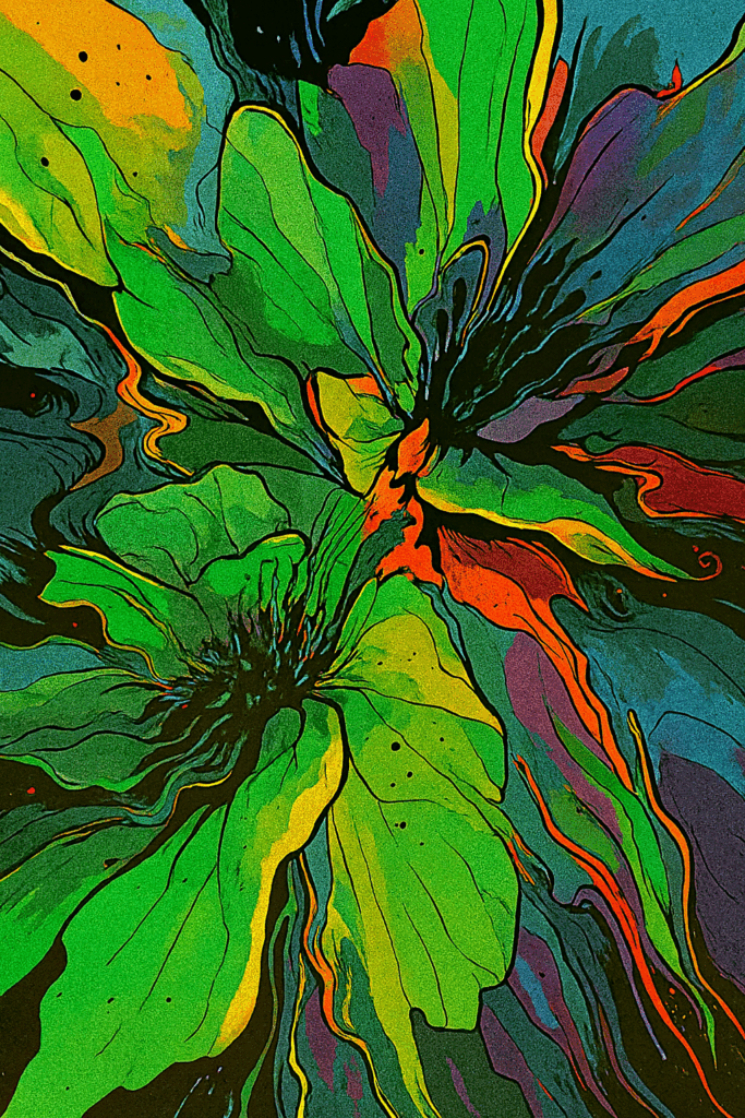 Ein Bild in Grün. Blätter, viele, geordnet im Zufall. Licht fällt in Schichten, zeichnet Kanten, deutet Tiefe an. Nichts ist übertrieben, alles wirkt genau so, wie es sein soll: ruhig, präzise, lebendig – eine stille Konstruktion aus Natur.