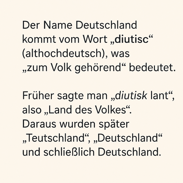 Der Name Deutschland kommt vom Wort „diutisc“ (althochdeutsch), was „zum Volk gehörend“ bedeutet.